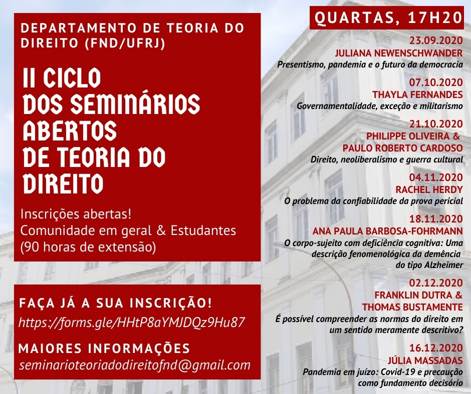Qual é a relação entre direito e literatura? É possível delimitar uma inter-relação suficientemente relevante para justificar o campo “Direito e Literatura”? Se sim, qual o objeto e quais as metodologias aportadas por esse novo campo? Pensando nessas questões, este I Ciclo de Direito e Literatura, organizado pelo Núcleo de Teoria dos Direitos Humanos (NTDH), pretende investigar como a Literatura toca o Poder Jurídico. Pode o jurista ser humanizado pela Literatura ou podemos apenas falar de mero “refinamento intelectual”? Nossos encontros acontecerão às sextas-feiras, com horários alternados (17h ou 18h). A transmissão será online, pelo https://www.facebook.com/nucleotdh. Serão 6 encontros com alguns dos mais proeminentes teóricos brasileiros na temática.